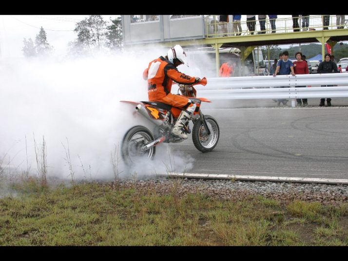 ウイリーしたままずーと走っちゃうしタイヤから白煙上がるほど回して停まってるしで、