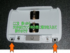 200系のGL系 大型リヤランプって言われる ルームランプ これ 脱着するには 周りのグレーの枠を外さない限り 取り付けネジには行き当たりません