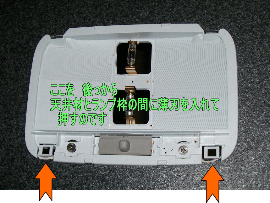 爪 で引っ掛かってるだけですが ちょいと特殊です 写真の↑の所に 薄刃ドライバーや薄板を使って 天井と枠の間に 車両後方から前方へ 押す 感じで勘合を外します これで 両ハジ はポコ と浮くので 中央部2箇所の爪も こじり起こして 枠を外します