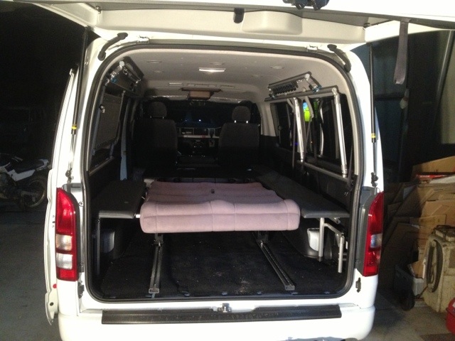 夜な夜な ヨロヨロ オフタイムのデモカー 7人乗りワゴンGL ヴァンテージ君 フルフラット化進行中の ボーデイジの採寸も同時進行で 頭と図面がえらいこと