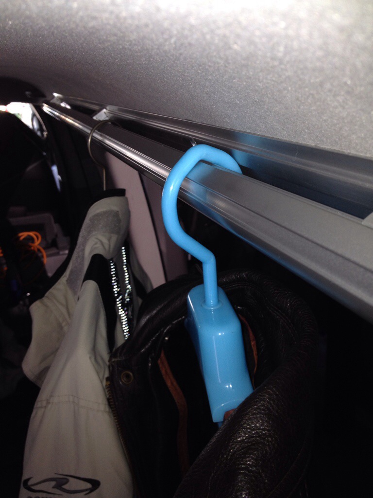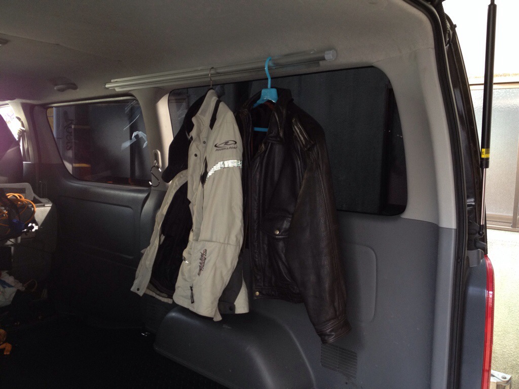 強度テストも兼ねてツーリングジャケット吊ってみますがこれ2着でも5Kg、撓みません。