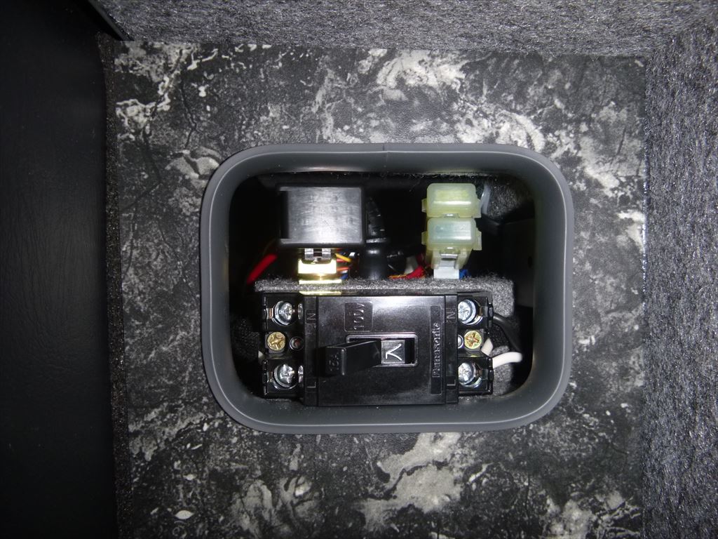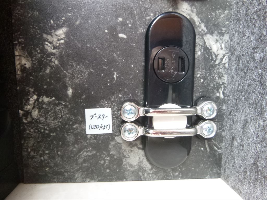触れないよう保護されている白スイッチは、サブバッテリ充電ブースターの入り切りスイッチです、こちらは通常 OFF のままで良いです