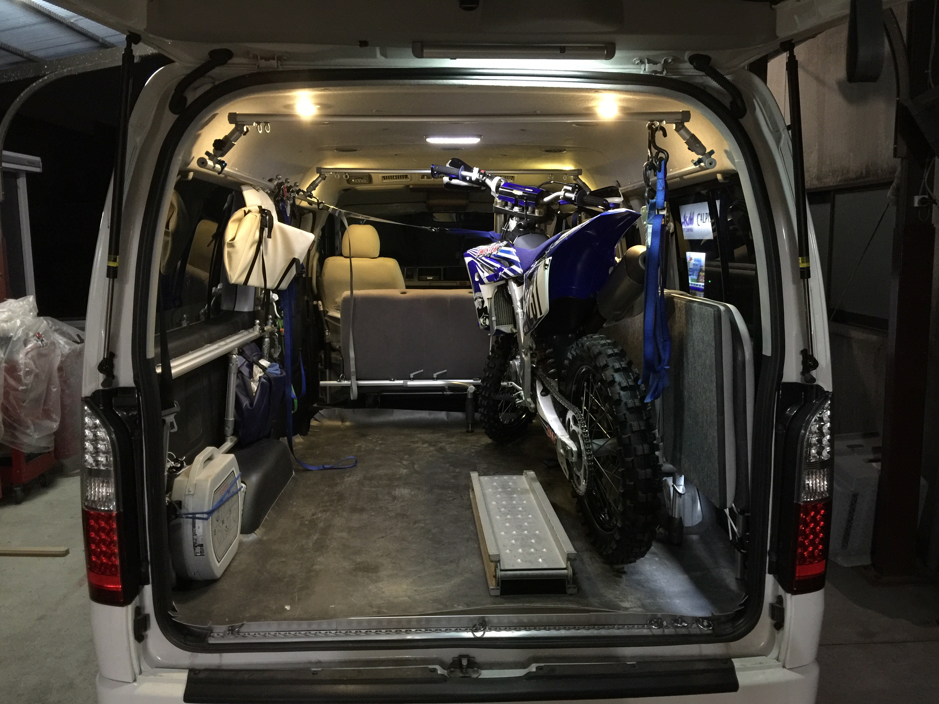 週末はエンデューロレースに、期待のルーキーと一緒に車中泊参加するから、バイクトランポモードに変身させました↓