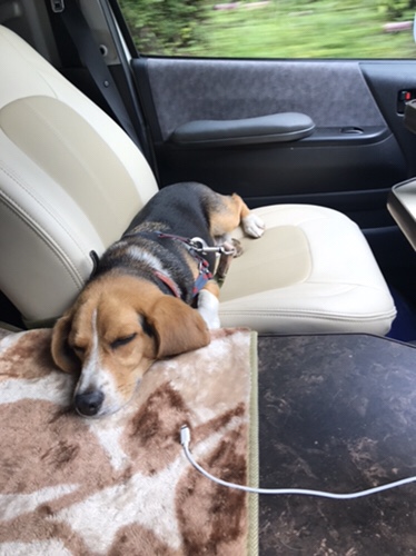 寅次郎は暑さと歩き疲れでグッタリ、帰りはクーラー効いたデモカー助手席でお休みモードに突入