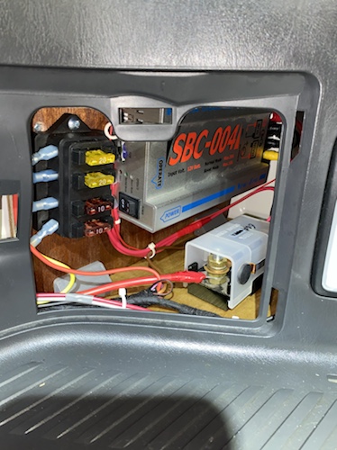 「サブバッテリーの走行充電装置などは、左ステップカバー中に入れちゃいましょう、やった事何台かあります。」