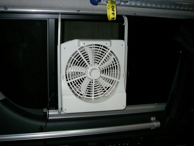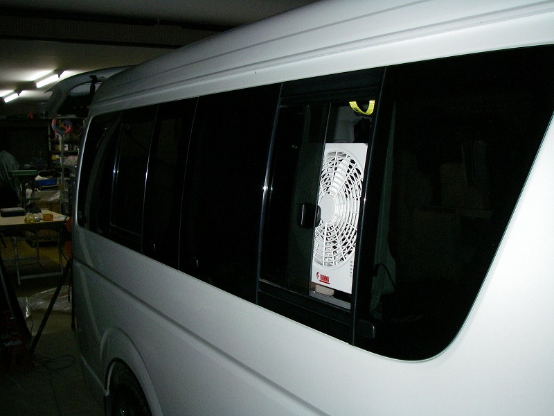 風量も 「これなら寝れる 思ったより有ルー」 です 最高。 ちょっと残念なのは このまま窓が閉めれない 使うときは脱着が要りますね 簡単だから良いかな、 ちなみに スライドドア側の小窓には 無加工で着きます が 外さないとドアが開かない・・