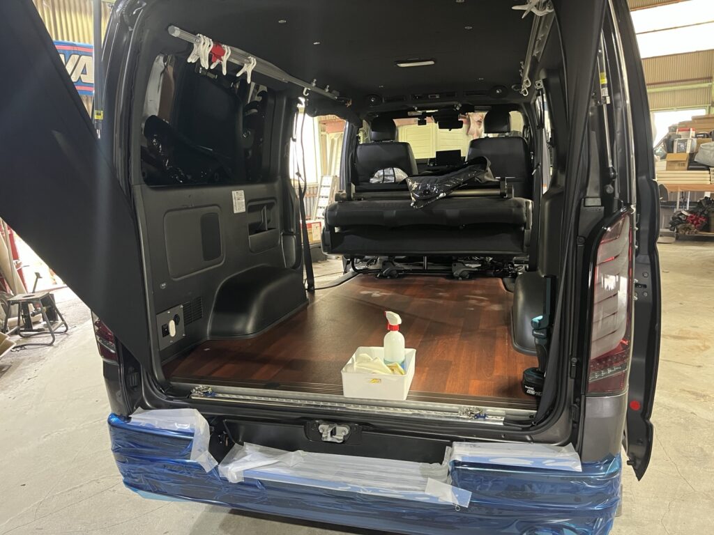 社外高級テールランプ取り付けと同時作業にて、ベッド脱着からの内装外し作業で、なんとかバンパーは外さずに